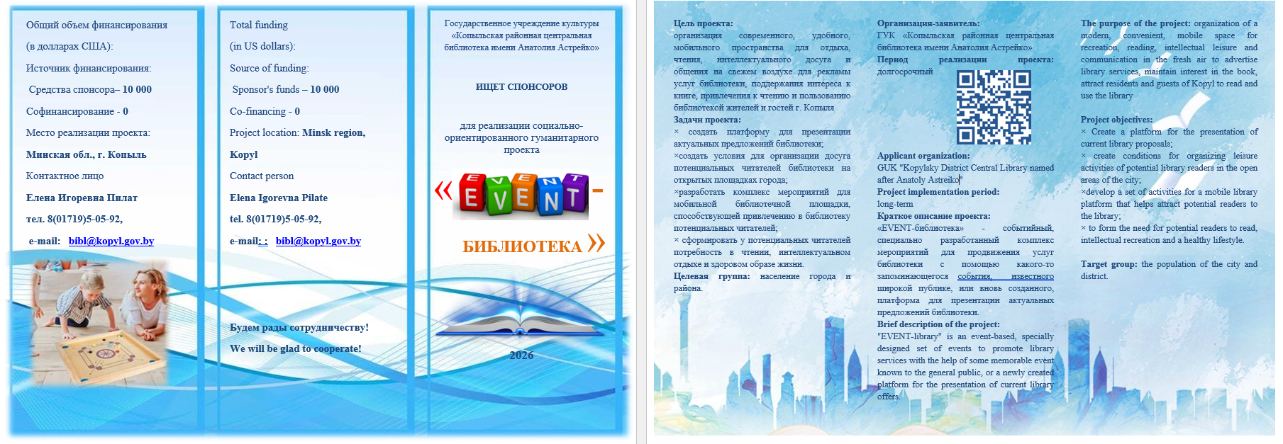 Государственное учреждение культуры «Копыльская районная центральная библиотека имени Анатолия Астрейко» ищет спонсоров для реализации социально-ориентированного гуманитарного проекта «EVENT-библиотека»