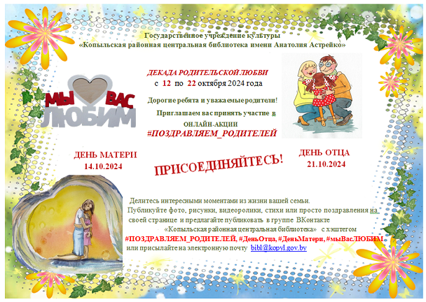 С 12 по 22 октября 2024 г. в ГУК «Копыльская районная центральная библиотека им. А. Астрейко» проходит Неделя родительской любви, приуроченная к празднованию Дня матери и Дня Отца.