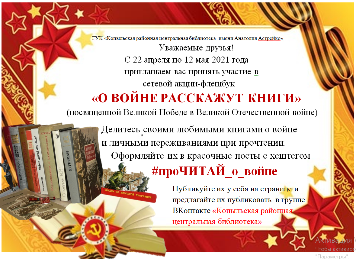С 22 апреля по 12 мая 2021 года приглашаем вас принять участие в сетевой акции-флешбук «О ВОЙНЕ РАССКАЖУТ КНИГИ» (посвященной Великой Победе в Великой Отечественной войне).